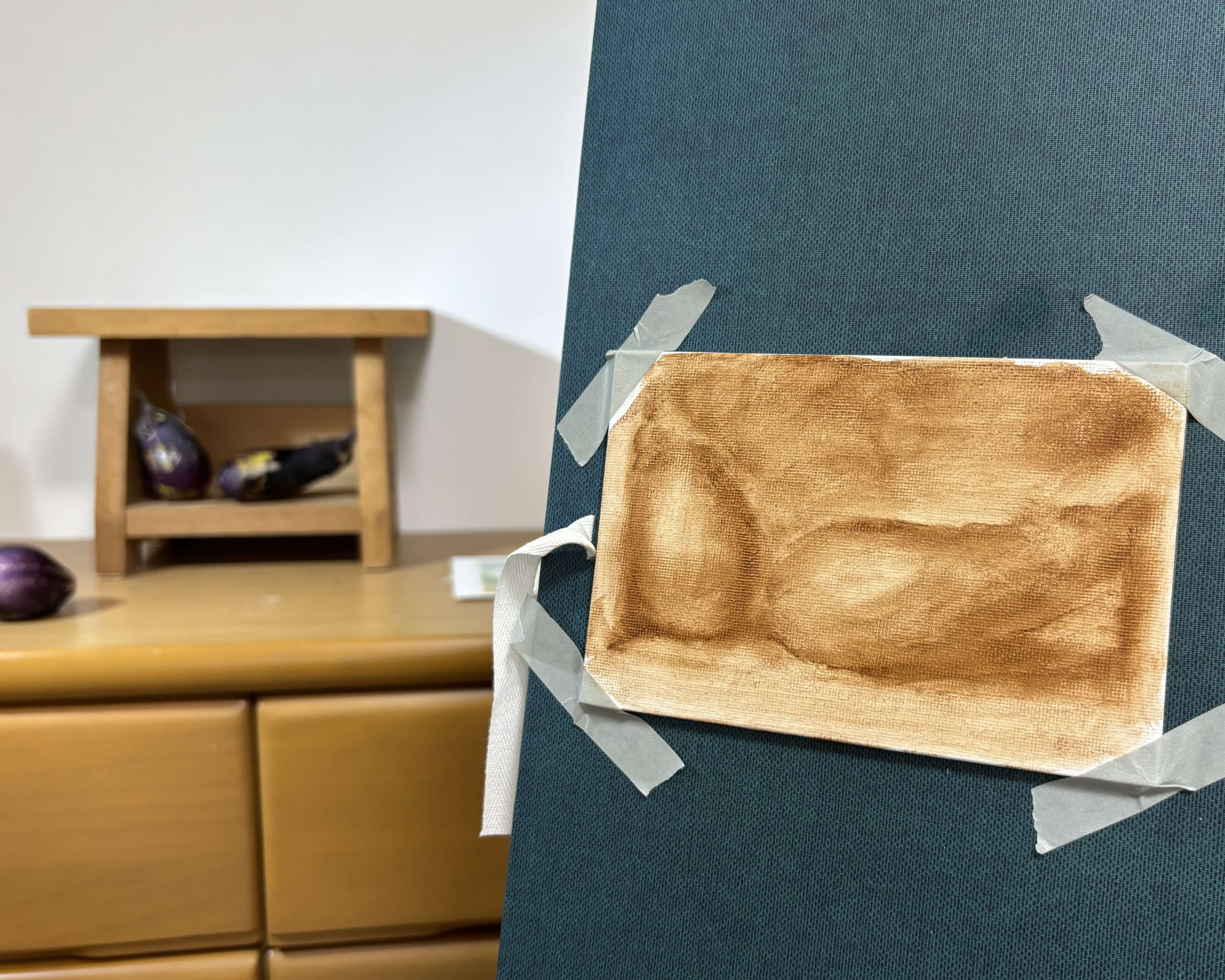 なすびは紫色、紫色を作るには赤と青を混ぜればよい…というイメージですが、今回描いたなすびの色は、赤(アリザリンクリムゾン)と青(ウルトラマリンブルー)だけでなく、こげ茶(バーントアンバー)や黄土色(イエローオーカー)なども混ぜて作ることができました。
