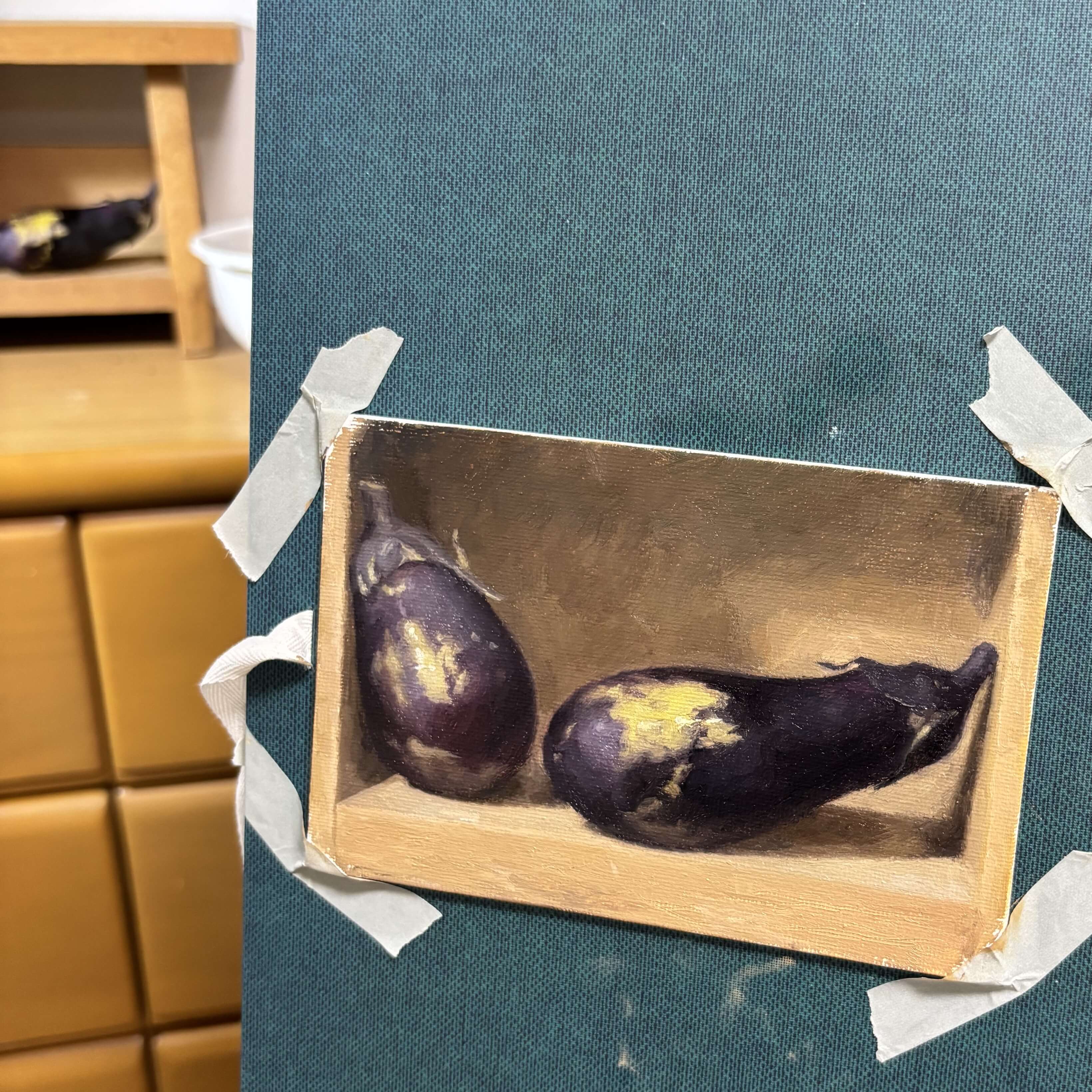 先日、家で採れたなすびを油彩でスケッチ(Oil Sketch)しました。何日もかけて何層にも絵の具を重ねる描き方ではなく、一日のみ、数時間で描くスケッチです。