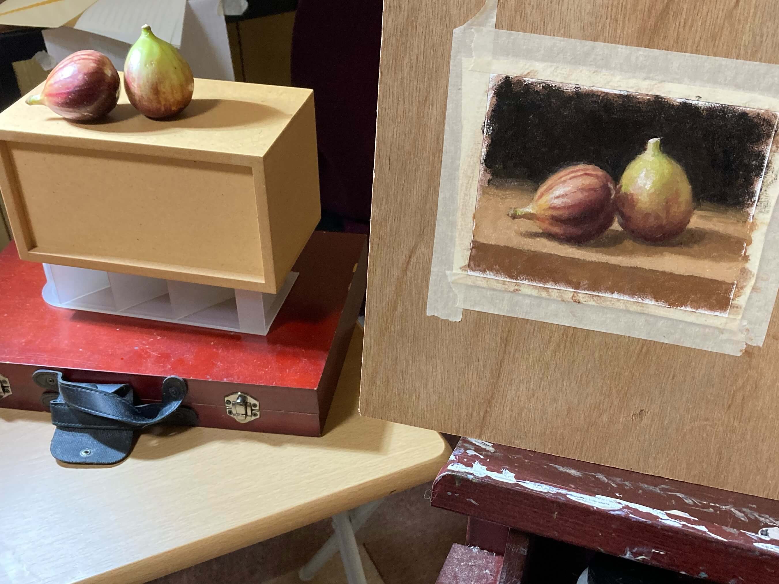 一つのいちじくの中に色の異なる部分があり、立体感と色の違いを同時にとらえるのが難しかったです。皮の表面は白っぽくマットな質感の部分があるのに、光沢もあり、透き通っているような感じもするのが面白いです。