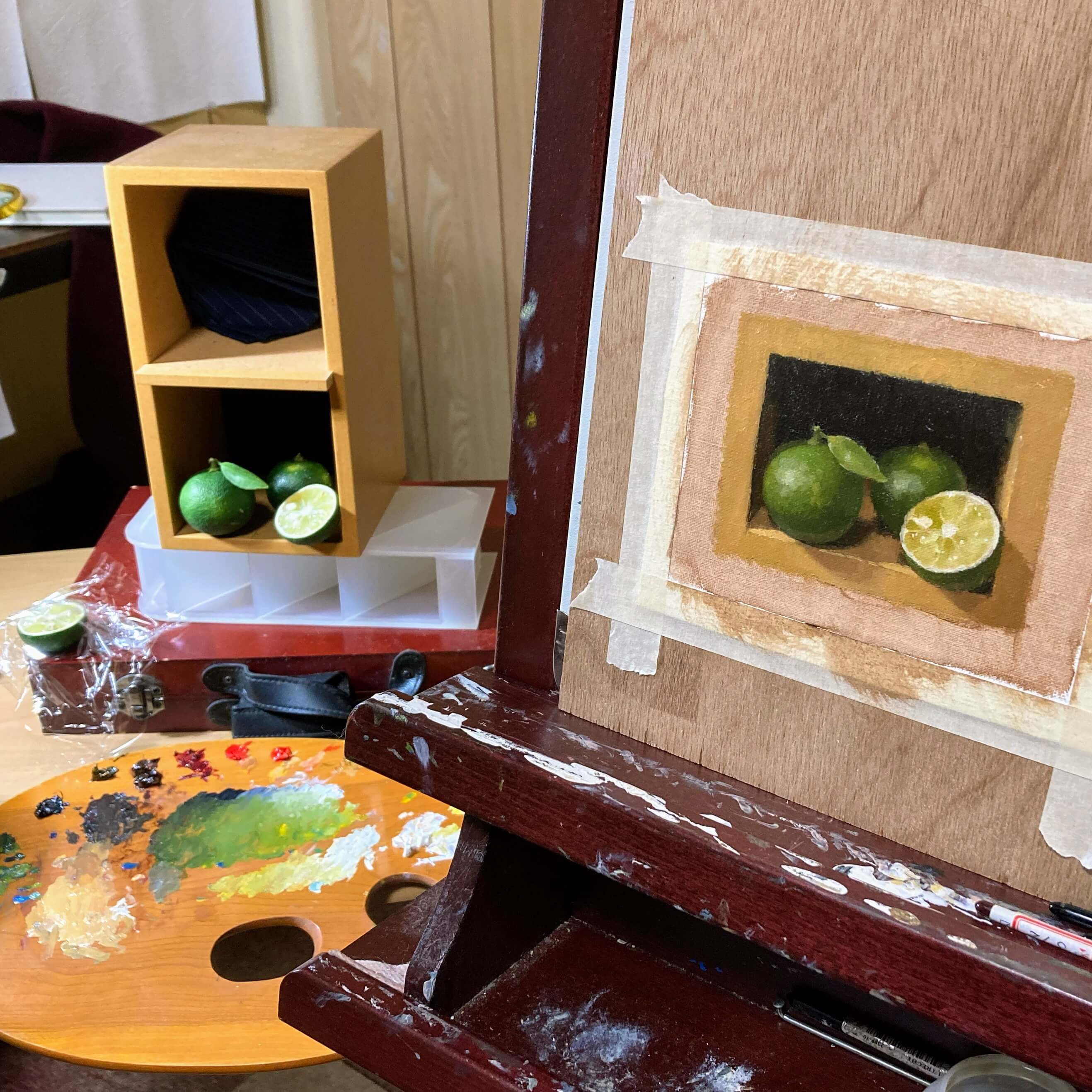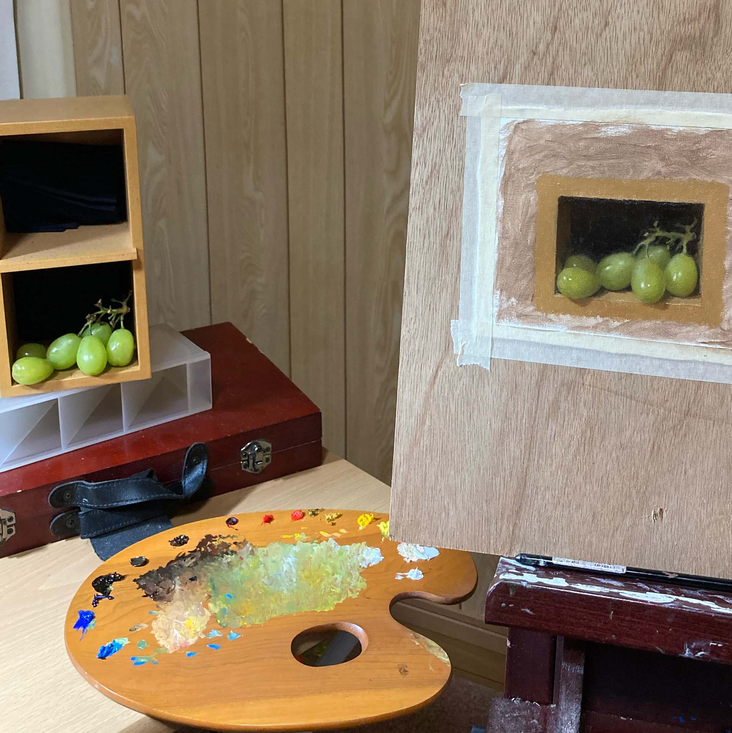 描く対象を観察して、パレットの上で絵の具を混ぜてその色を作ったらキャンバスに色を置いてみて、本物と見比べながら描いていきます。